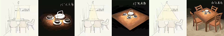 5、材質、光束角度、光源色彩等靈活應用。材質不同,其中透明度、反射率、折射率、發光度等都不同。不同方向的燈光照射在同一物體上,表現出來的光澤和肌理也是不一樣,靈活駕馭光線的特點,可以讓餐廳墻面或者物體及軟裝陳設品產生豐富的光暈和肌理的變化。同一個光源,扣上不同型號的燈杯后,它可以產生大小不一的光斑,如果我們從燈體發散一條射線到達光斑邊緣,線與燈之間形成的角度就是光束角。相同功率的燈杯,光束角越大,中心光強越小,發散出的光斑越柔和;相反,光束角越小,中心光強越大,發散出的光斑越生硬。不同光束角打在墻上的光斑大小是不一樣的,一般20度以下的叫窄光束角,20~40度叫中光束角,40度以上叫寬光束角。在品深餐飲空間設計中,一般中餐廳的照明使用的光速角在37度,用光線可以覆蓋整個餐桌;而咖啡館喜歡用15度的光速角,光源聚焦在咖啡杯。